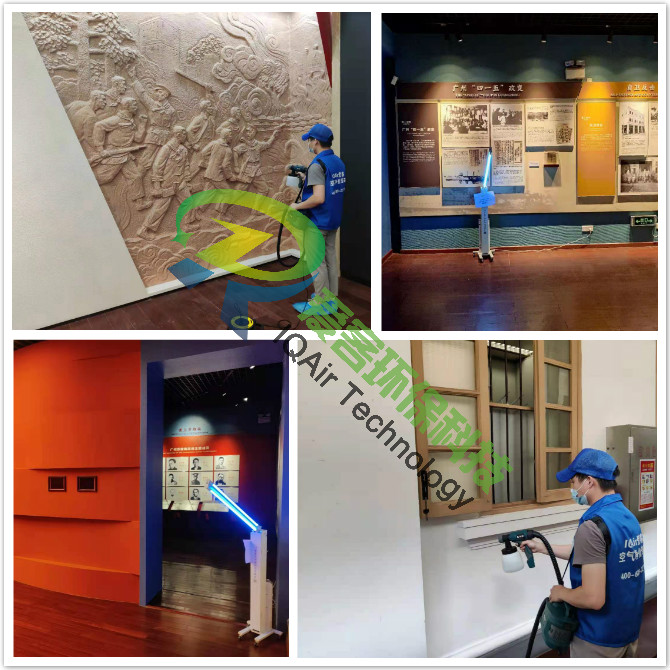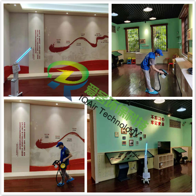 愛客工程師們對紀念館一、二樓展區(qū)地板、墻面、翻新門窗表面逐一噴灑愛客濃縮型異味分解酶(食品級)與強力TVOC清除劑(食品級),以消除化學(xué)異味分子,降解甲醛及TVOC。并結(jié)合紫外線燈進行殺菌消毒治理。